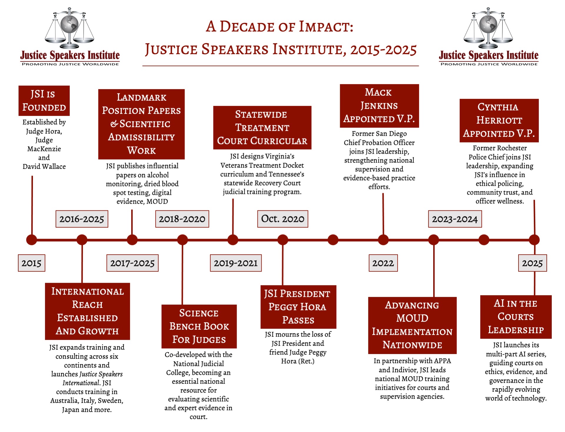 As the Justice Speakers Institute (JSI) celebrates ten years of advancing evidence-based justice, I am reminded of how far JSI has come, and the opportunities that lie ahead. When I first joined JSI, working on the Virginia Veterans Treatment Docket curriculum project, I was drawn to its mission because it reflected the same principles that have guided my career: integrity, fairness, and the belief that the justice system could change lives. The work with JSI was also quite simply, fun.